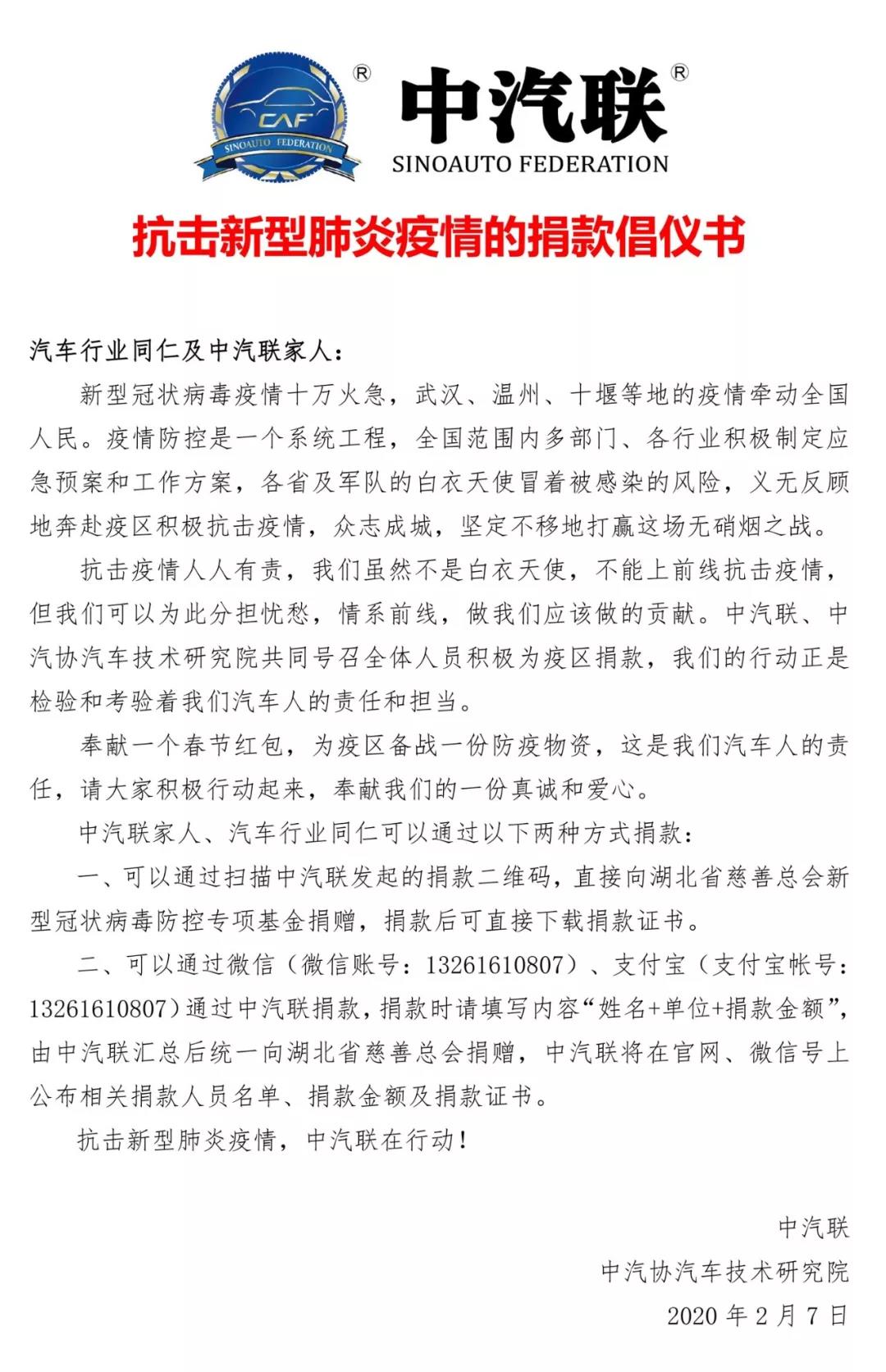 中汽聯(lián)先后三次發(fā)起抗疫募捐倡議書