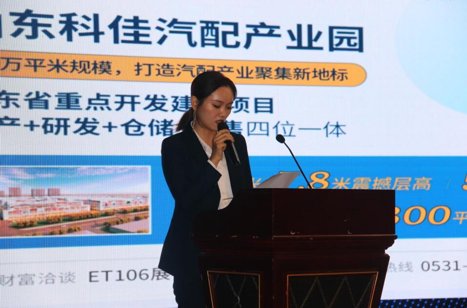 山東科佳智能裝備城總監(jiān)許婧做了項(xiàng)目推薦。山東科佳智能裝備城是濟(jì)南市重點(diǎn)項(xiàng)目、山東省重大項(xiàng)目,是先進(jìn)汽配產(chǎn)業(yè)集群園區(qū)、北方重要的汽配產(chǎn)業(yè)聚集地,建設(shè)完成后將成為國內(nèi)定位最高、規(guī)模最大、產(chǎn)業(yè)鏈最長、服務(wù)職能最全的現(xiàn)代化汽配產(chǎn)業(yè)園區(qū)。