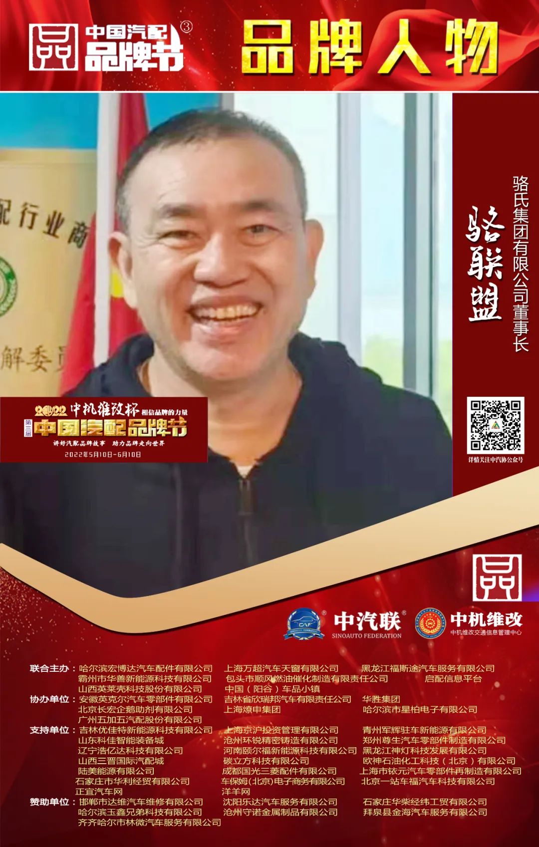 駱總作為玉環(huán)縣汽摩配行業(yè)協(xié)會創(chuàng)會會長、浙江省汽摩配行業(yè)商會監(jiān)事會主席、中國汽車工業(yè)協(xié)會常務(wù)理事、全國工商聯(lián)汽摩配商會常務(wù)副會長,多次出席中國汽車工業(yè)協(xié)會零部件年會、長三角科技論壇并發(fā)表演講,闡述自己觀點,引導(dǎo)產(chǎn)業(yè)發(fā)展,贏得業(yè)內(nèi)人士的廣泛尊重。他曾榮獲臺州市優(yōu)秀企業(yè)家、臺州市優(yōu)秀中國特色社會主義事業(yè)建設(shè)者,玉環(huán)縣功勛企業(yè)家、公益活動慈善家、2021年中國汽零部件行業(yè)大國工匠等榮譽稱號。