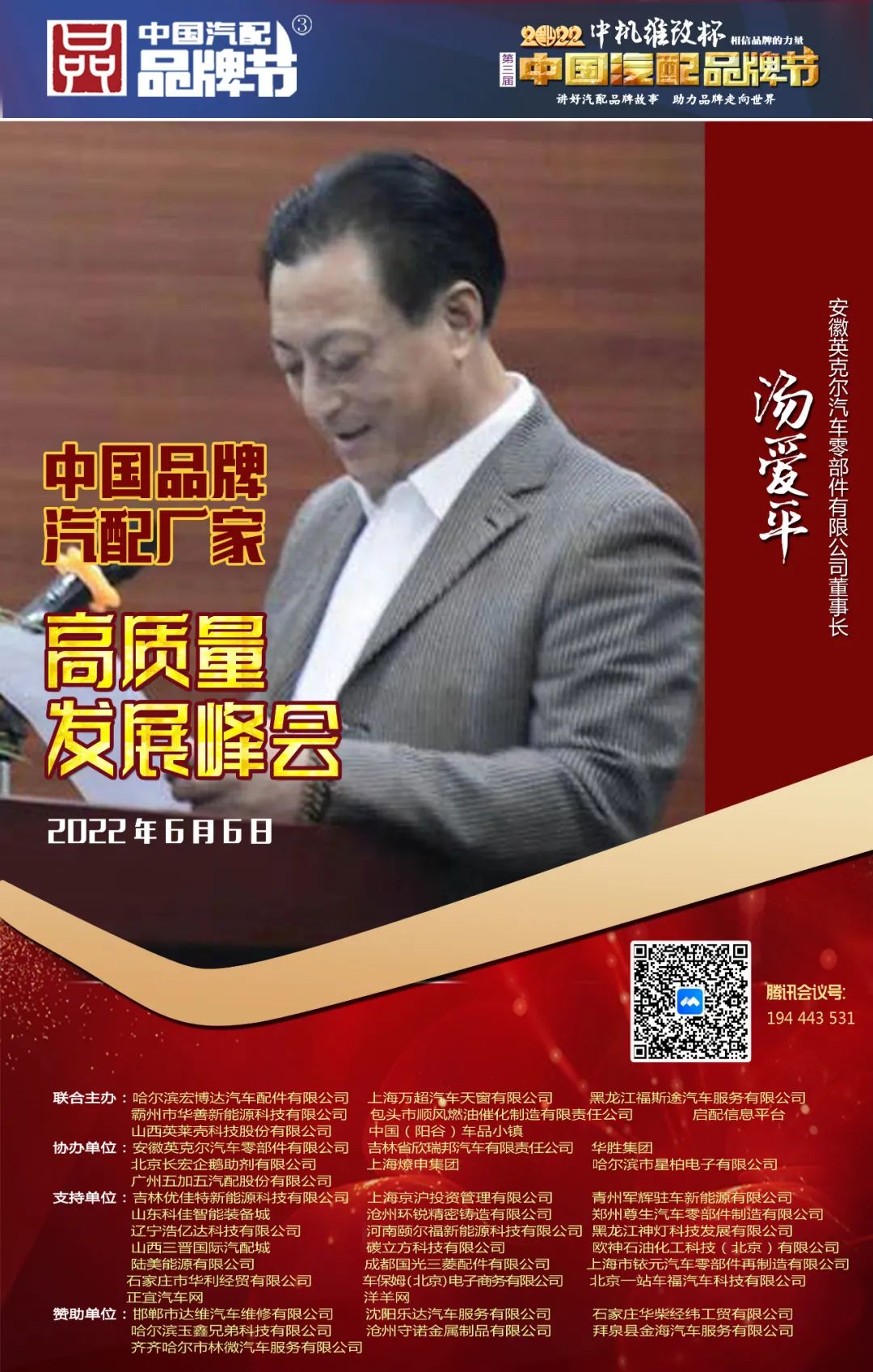 湯愛(ài)平董事長(zhǎng)是全國(guó)杰出浙商,現(xiàn)任中汽聯(lián)理事長(zhǎng)、臺(tái)州英克爾傳動(dòng)軸有限公司董事長(zhǎng),安徽英克爾汽車零部件有限公司董事長(zhǎng)。先后擔(dān)任玉環(huán)市汽摩配行業(yè)副會(huì)長(zhǎng)、浙江省汽摩配行業(yè)商會(huì)副會(huì)長(zhǎng)、全國(guó)工商聯(lián)汽摩配用品制造分會(huì)副會(huì)長(zhǎng)、工信部中國(guó)電子商務(wù)協(xié)會(huì)汽車行業(yè)分會(huì)常務(wù)副會(huì)長(zhǎng)、中國(guó)質(zhì)量萬(wàn)里行促進(jìn)會(huì)汽車委員會(huì)常務(wù)副會(huì)長(zhǎng)、全國(guó)工商聯(lián)汽車經(jīng)銷商商會(huì)后市場(chǎng)分會(huì)常務(wù)副會(huì)長(zhǎng)、中國(guó)汽車工業(yè)協(xié)會(huì)后市場(chǎng)用品分會(huì)常務(wù)副會(huì)長(zhǎng)等職務(wù)。
