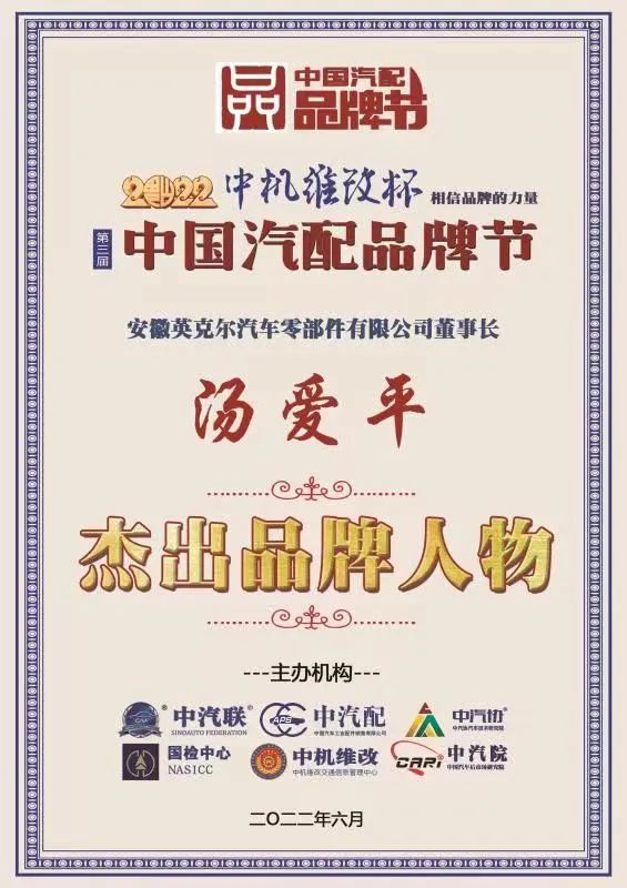 據(jù)《2022中國(guó)汽配品牌榜》榜單顯示:安徽英克爾董事長(zhǎng)湯愛(ài)平 榮膺“2022中國(guó)汽配行業(yè)杰出品牌人物”、英克爾榮膺“中國(guó)汽配行業(yè)杰出品牌企業(yè)”兩項(xiàng)大獎(jiǎng)。