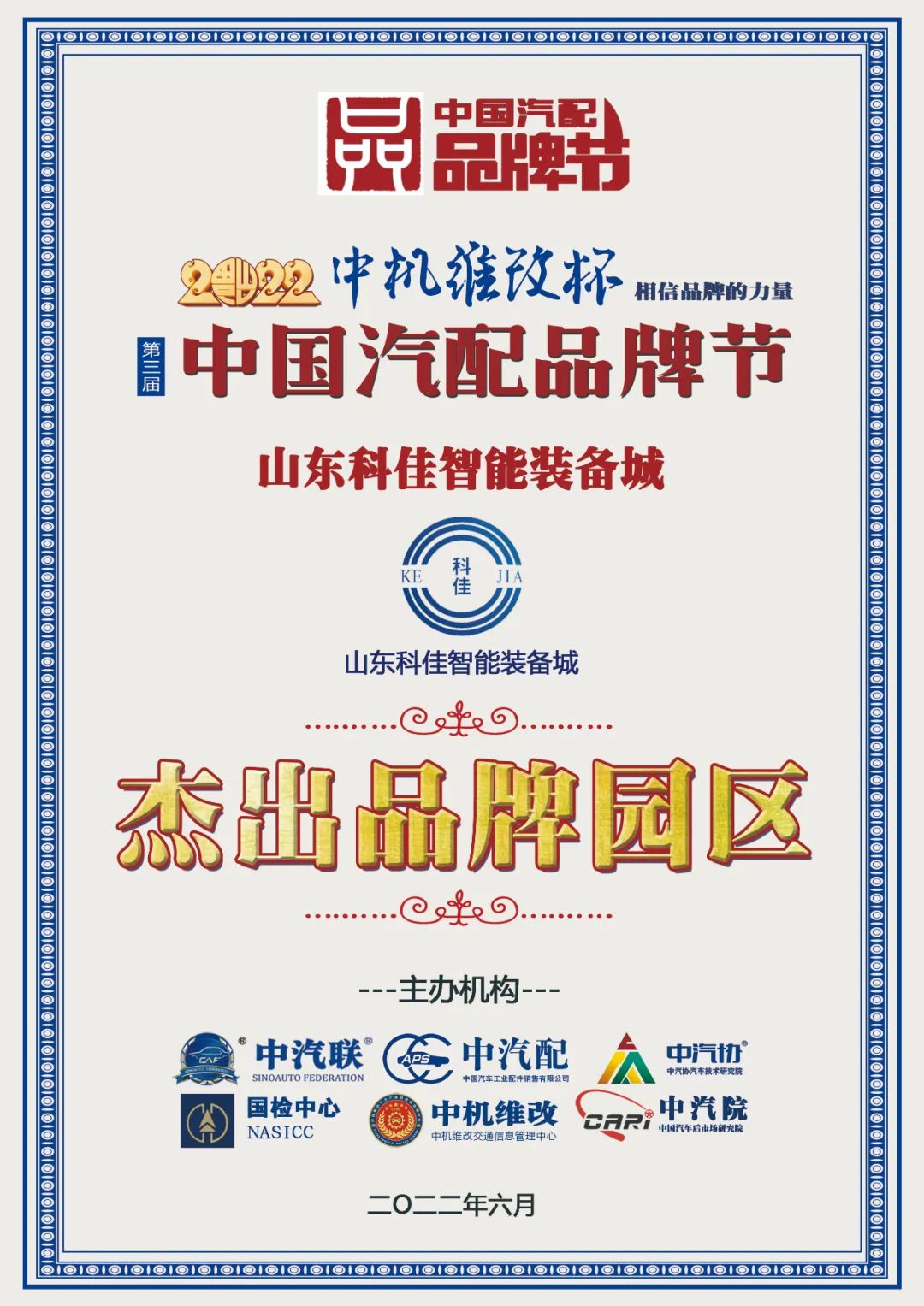 據(jù)《2022中國汽配品牌榜》榜單顯示:山東科佳智能裝備城榮膺“2022中國汽配行業(yè)杰出品牌園區(qū)”大獎。
