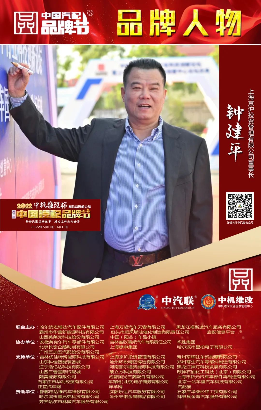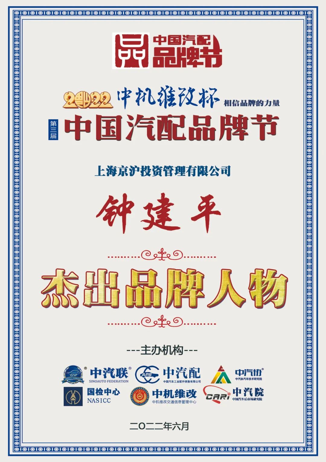 據(jù)《2022中國(guó)汽配品牌榜》榜單顯示:上海京滬投資管理有限公司董事長(zhǎng)鐘建平榮膺“2022中國(guó)汽配行業(yè)杰出品牌人物”大獎(jiǎng)。