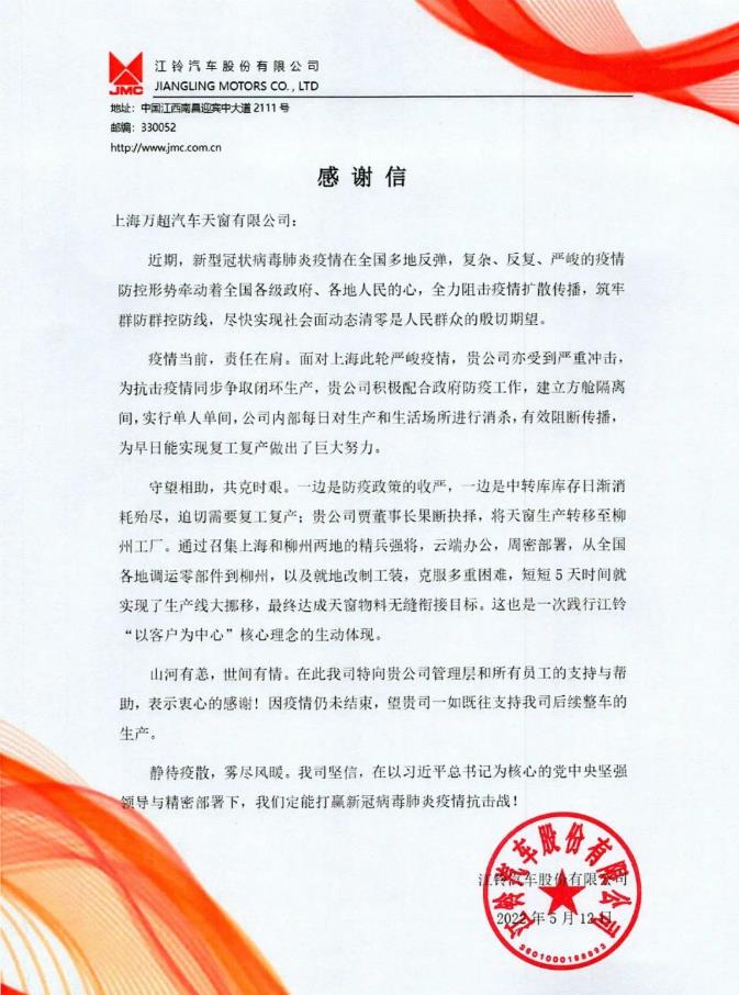 2022年6月22日上午9:30,上海市嘉定區(qū)政協(xié)副主席徐鋒一行蒞臨上海萬超汽車天窗有限公司考察調(diào)研,對(duì)企業(yè)在復(fù)工復(fù)產(chǎn)后,和疫情期間所面臨的各項(xiàng)工作難點(diǎn)進(jìn)行調(diào)研,中汽聯(lián)主席、上海萬超汽車天窗有限公司董事長賈公棋親自對(duì)嘉定區(qū)政協(xié)領(lǐng)導(dǎo)的來訪表示熱烈的歡迎。