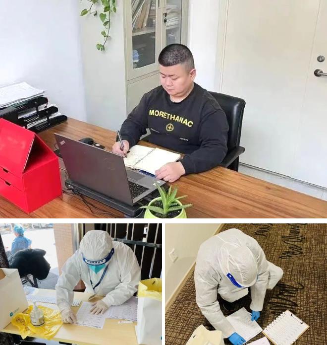 物業(yè)主管徐仲卿所負責的燎申宜山大廈內(nèi),既有數(shù)十家商務(wù)辦公企業(yè),也有一家漢庭酒店,進出人員來自市內(nèi)外各地區(qū),對物業(yè)部的疫情防控工作提出了較大挑戰(zhàn)。四月上旬,酒店內(nèi)出現(xiàn)一例核酸異常人員,旅客及工作人員都要進行自我隔離,酒店的日常監(jiān)管工作便轉(zhuǎn)移到了大廈物業(yè)部,徐仲卿作為部門負責人,承擔起了酒店日常管理及人員聯(lián)絡(luò)工作,保障隔離人員的一日三餐和正常生活供應(yīng)。每天兩次自測抗原時,徐仲卿穿著隔離服,挨個房間將抗原發(fā)放給大廈內(nèi)所有隔離人員,然后再逐一收回,并做好拍照登記工作,核酸采樣時也親自陪同醫(yī)護人員上門采樣。