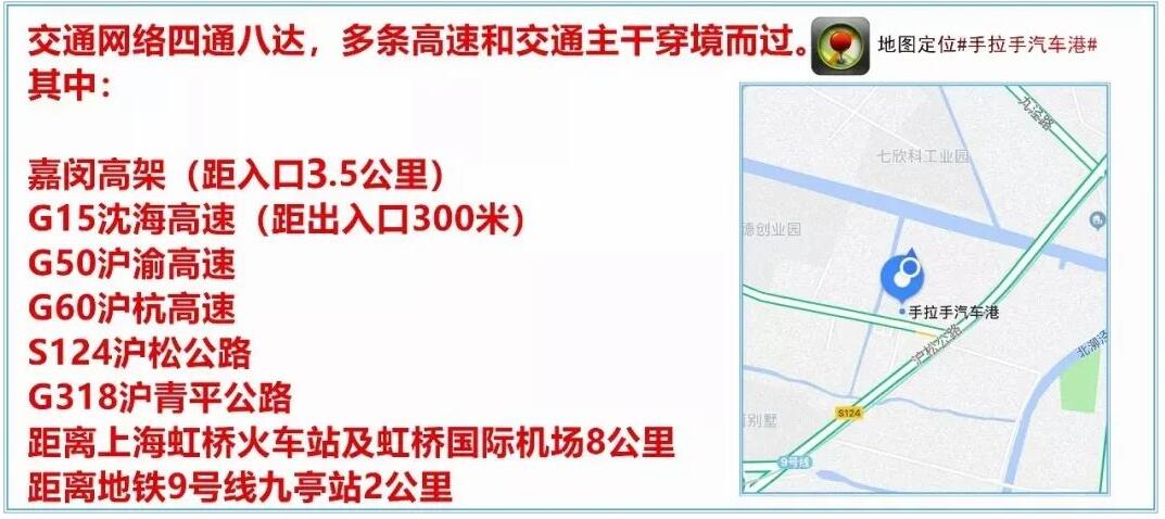 手拉手汽車港位于上海市松江區(qū)泗涇鎮(zhèn)九干路50號(滬松公路口),地鐵9號線貫穿而過,夜間乘坐9號線可以欣賞到我們園區(qū)美美的燈光秀哦!