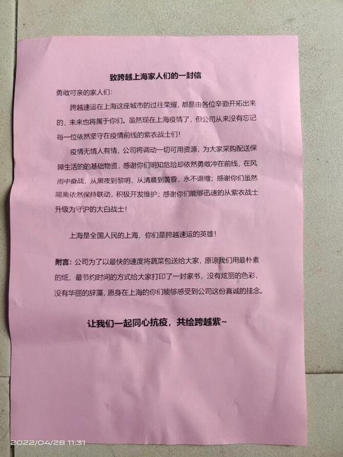(跨越速運總部致跨越上海家人們的一封信)