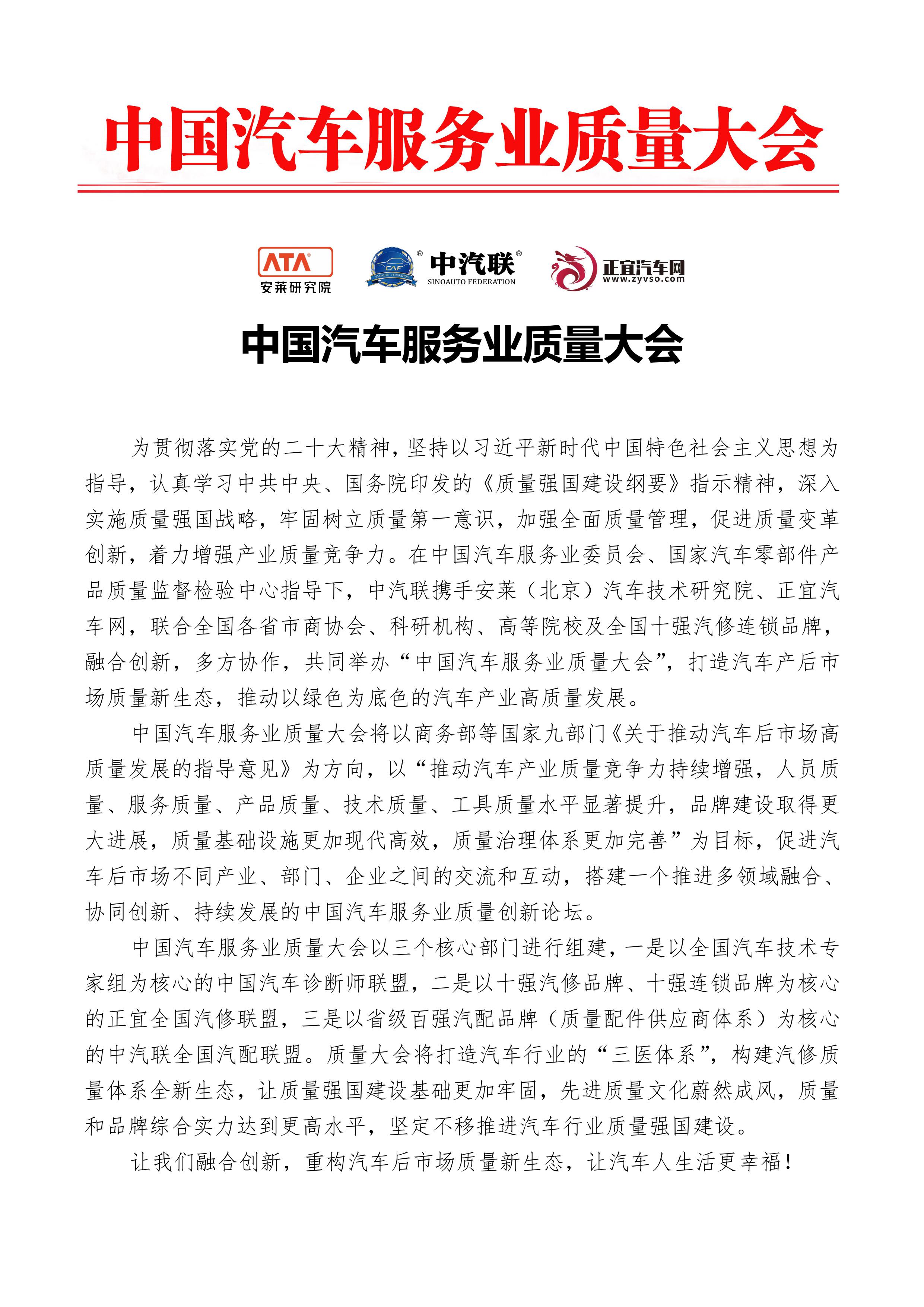 為貫徹落實黨的二十大精神,堅持以習近平新時代中國特色社會主義思想為指導,認真學習中共中央、國務院印發(fā)的《質量強國建設綱要》指示精神,深入實施質量強國戰(zhàn)略,牢固樹立質量第一意識,加強全面質量管理,促進質量變革創(chuàng)新,著力增強產(chǎn)業(yè)質量競爭力。在中國汽車服務業(yè)委員會、國家汽車零部件產(chǎn)品質量監(jiān)督檢驗中心指導下,中汽聯(lián)攜手安萊(北京)汽車技術研究院、正宜汽車網(wǎng),聯(lián)合全國各省市商協(xié)會、科研機構、高等院校及全國十強汽修連鎖品牌,融合創(chuàng)新,多方協(xié)作,共同舉辦“中國汽車服務業(yè)質量大會”,打造汽車產(chǎn)后市場質量新生態(tài),推動以綠色為底色的汽車產(chǎn)業(yè)高質量發(fā)展。