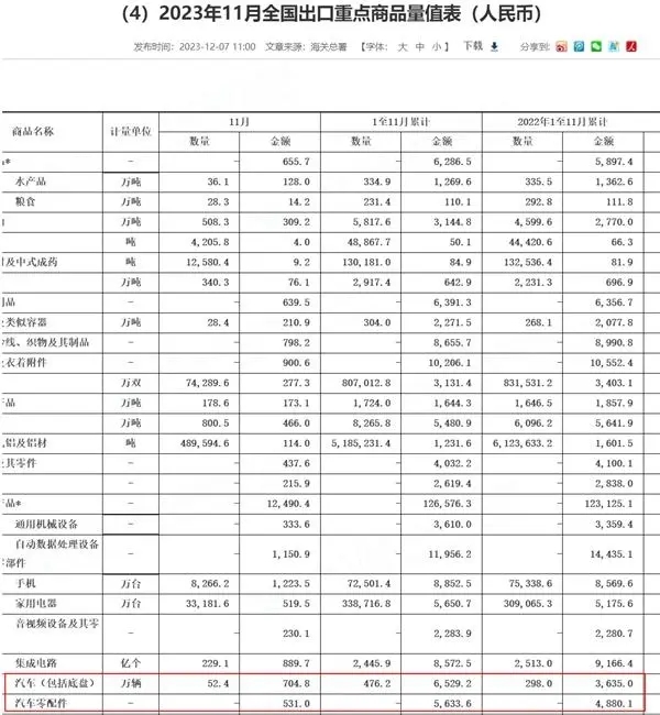 日前,海關(guān)總署發(fā)布數(shù)據(jù):11月,汽車(包括底盤)共出口52.4萬輛,出口金額為704.8億元。1-11月,累計(jì)出口476.2萬輛,同比增長59.8%;出口總金額為6529.2億元,增長79.6%。