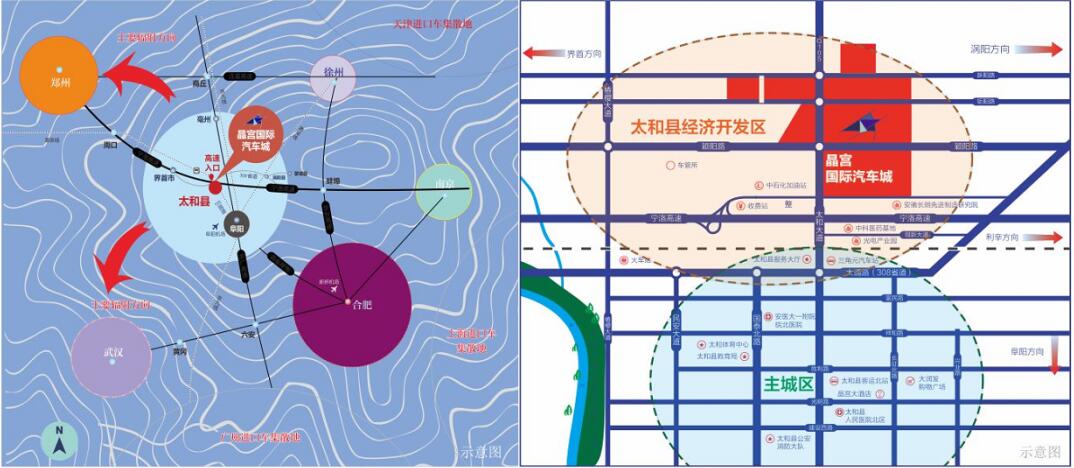 【晶宮國際汽車城】項(xiàng)目是晶宮控股集團(tuán)有限公司精心規(guī)劃投資的重點(diǎn)項(xiàng)目,項(xiàng)目位于太和縣G36寧洛高速出入口,地處北部新城,政府重點(diǎn)打造區(qū)域,總占地約1300畝,建筑面積超100萬方。項(xiàng)目規(guī)劃以綜合汽車展廳和精品二手車銷售展示作為龍頭,以汽車博覽、汽車后市場為主導(dǎo),結(jié)合平行進(jìn)口車,品牌4S店為特色,涵蓋風(fēng)情商業(yè)街、學(xué)校、酒店、等相關(guān)配套設(shè)施 --立志“打造中原一站式汽車產(chǎn)業(yè)衛(wèi)星城。”項(xiàng)目建成可輻射周邊150公里,包括皖北、豫南、蘇北等地區(qū),輻射人口達(dá)1.5億。