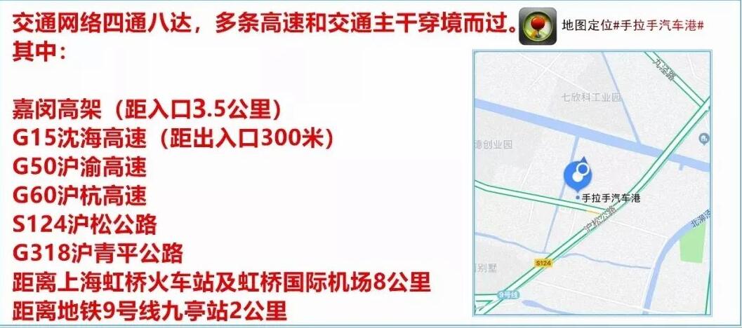 手拉手汽車港位于上海市松江區(qū)泗涇鎮(zhèn)九干路50號(hào)(滬松公路口),地鐵9號(hào)線貫穿而過(guò),夜間乘坐9號(hào)線可以欣賞到我們園區(qū)美美的燈光秀哦
