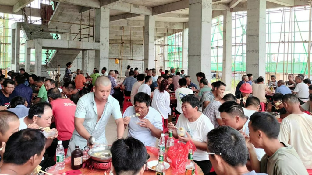 ? 中午在項(xiàng)目現(xiàn)場,航信汽貿(mào)城為奮戰(zhàn)在一線的工友們準(zhǔn)備了豐盛的慶功宴,工友們喝著幸福的喜酒,歡歌笑語話家常,幸福和快樂溢于言表。
