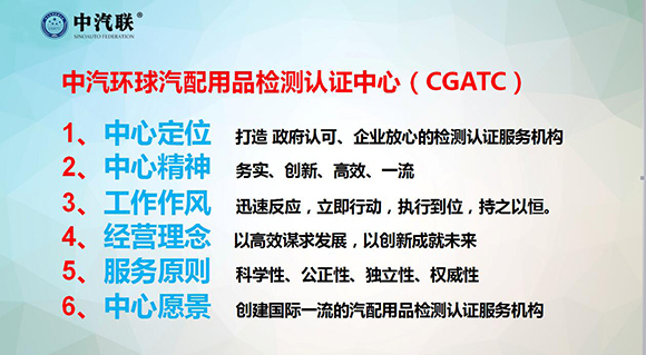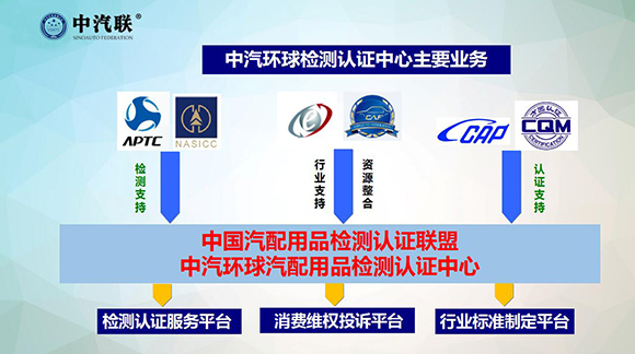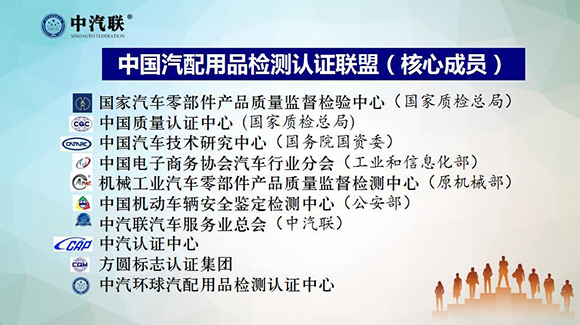 中汽聯(lián)攜手國(guó)家權(quán)威檢測(cè)認(rèn)證機(jī)構(gòu)——國(guó)家汽車(chē)零部件產(chǎn)品質(zhì)量監(jiān)督檢驗(yàn)中心、機(jī)械工業(yè)汽車(chē)零部件產(chǎn)品質(zhì)量監(jiān)督檢測(cè)中心、中汽認(rèn)證中心、方圓標(biāo)志認(rèn)證集團(tuán)等共同打造專業(yè)檢測(cè)認(rèn)證領(lǐng)域的服務(wù)機(jī)構(gòu) “中汽環(huán)球汽配用品檢測(cè)認(rèn)證中心”及“中國(guó)汽配用品檢測(cè)認(rèn)證聯(lián)盟” 。