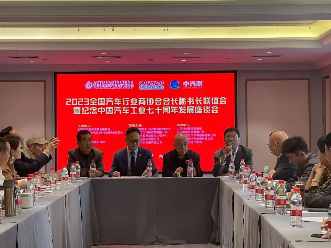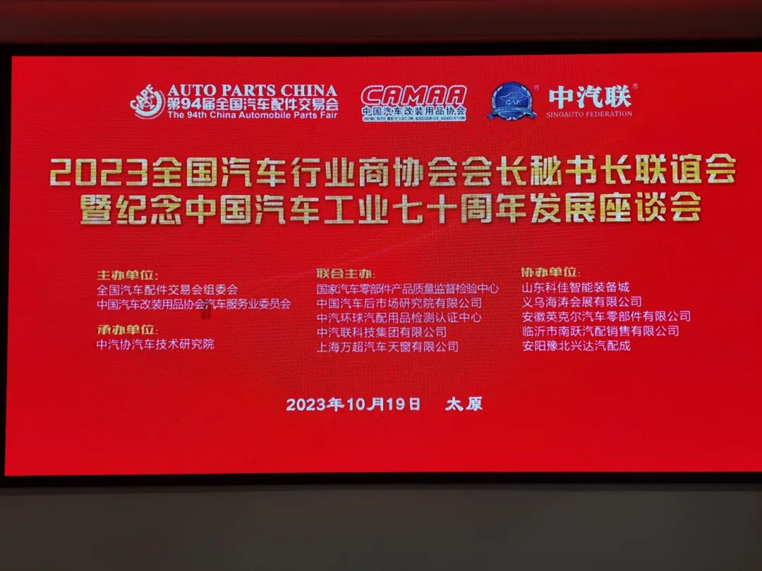 2023全國汽車行業(yè)商協(xié)會(huì)會(huì)長秘書長聯(lián)誼會(huì)暨紀(jì)念中國汽車工業(yè)七十周年發(fā)展座談會(huì)由中汽聯(lián)發(fā)起,中國汽車改裝用品協(xié)會(huì)汽車服務(wù)業(yè)委員會(huì)、全國汽車配件交易會(huì)組委會(huì)主辦,國家汽車零部件產(chǎn)品質(zhì)量監(jiān)督檢驗(yàn)中心、中國汽車后市場研究院、上海萬超汽車天窗有限公司、北京中汽聯(lián)科技集團(tuán)聯(lián)合主辦,中汽環(huán)球汽配用品檢測認(rèn)證中心、山東科佳智能裝備城、義烏海濤會(huì)展有限公司、安徽英克爾汽車零部件有限公司、安陽豫北興達(dá)汽配城、臨沂市南躍汽配銷售有限公司友情協(xié)辦,中汽協(xié)汽車技術(shù)研究院承辦。