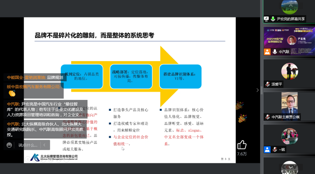 北大縱橫高級(jí)合伙人、北大縱橫大交通研究院院長(zhǎng)尹宏亮為大家分享了“品牌規(guī)劃”的專題報(bào)告。尹院長(zhǎng)是全國(guó)資深管理專家,深諳汽車行業(yè)組織的變化趨勢(shì),曾經(jīng)為行業(yè)內(nèi)多家企業(yè)提供咨詢服務(wù),內(nèi)容涉及:戰(zhàn)略、營(yíng)銷、組織、薪酬、考核、企業(yè)文化等多方面內(nèi)容,是中國(guó)汽車行業(yè)“最佳智庫(kù)”的代表人物;他專注于企業(yè)文化建設(shè)及人力資源項(xiàng)目管理培訓(xùn)和咨詢,對(duì)企業(yè)文化建設(shè)及人力資源實(shí)操過程中常見問題及難題有獨(dú)到見解;近二十年的工作積累,十年的培訓(xùn)及管理咨詢經(jīng)驗(yàn),先后為近百家以上的企業(yè)或品牌提供過專業(yè)的管理咨詢。