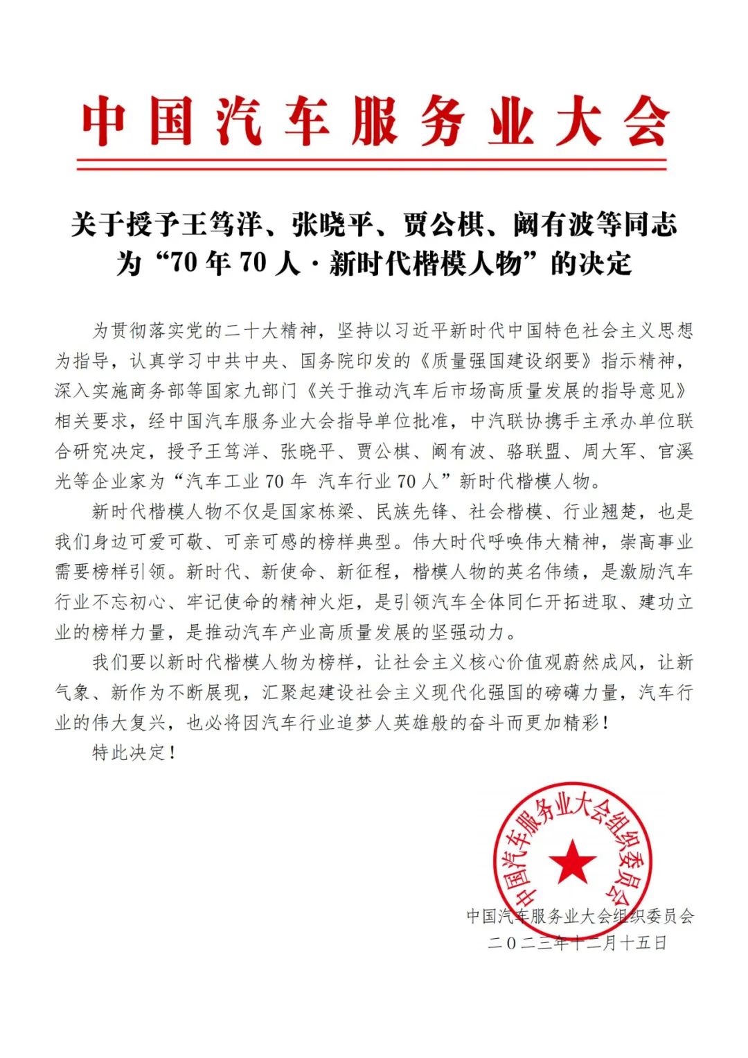 汽車行業(yè)70年70人新時代楷模人物榜單