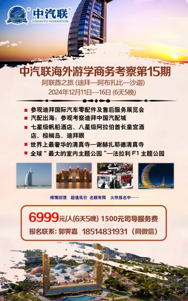 第15期 中汽聯(lián)(迪拜)海外游學(xué)商務(wù)考察活動已全面啟動,即日起接受報名,名額有限,報滿為止,報名截止2024年11月20日。