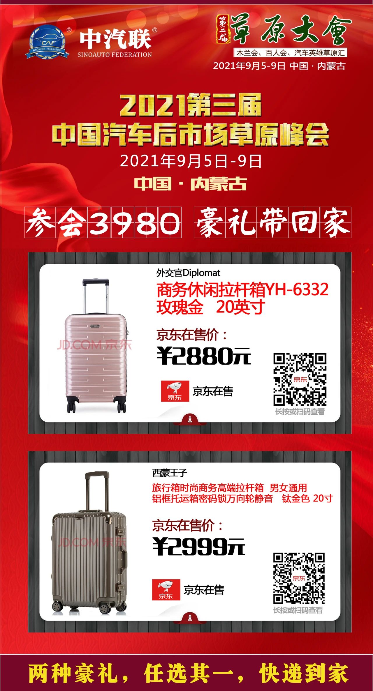 2、會務(wù)費:3980元/人(5天4晚,如需單間:補單房差800元/人)費用包含大會期間四晚四星級酒店住宿、餐飲、培訓、參加峰會、旅游拓展、考察對接、交通大巴,京東零售價2980元西蒙王子商務(wù)拉桿箱或外交官/Diplomat商務(wù)休閑拉桿箱等費用,不包含從駐地到鄂爾多斯的往返交通費用。