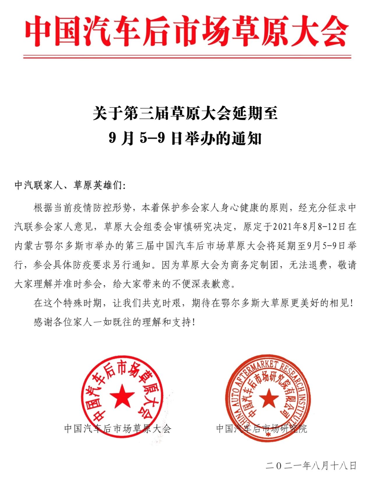 2021年是建黨100周年,也是國家實現(xiàn)“十四五”規(guī)劃目標和2035遠景目標的開局之年,國家經(jīng)濟已由高速增長階段轉(zhuǎn)向高質(zhì)量發(fā)展階段,外部環(huán)境不穩(wěn)定性不確定性態(tài)勢增強。面對外部環(huán)境的深刻變化、經(jīng)濟社會發(fā)展的新形勢,為應(yīng)對挑戰(zhàn)和搶抓機遇,由中汽聯(lián)、中汽協(xié)聯(lián)合主辦的“憶黨史銘黨恩 喜迎建黨百年——第三屆中國汽車后市場草原大會暨2021中國汽車后市場草原峰會”將于2021年9月5日-9日在內(nèi)蒙古鄂爾多斯舉辦(原定日期為8月8日-12日,因疫情原因延期,各種權(quán)益均保留不變),學黨史、悟思想、辦實事、開新局,以特殊的方式慶祝中國共產(chǎn)黨成立100周年,為汽車人突圍獻計獻策。