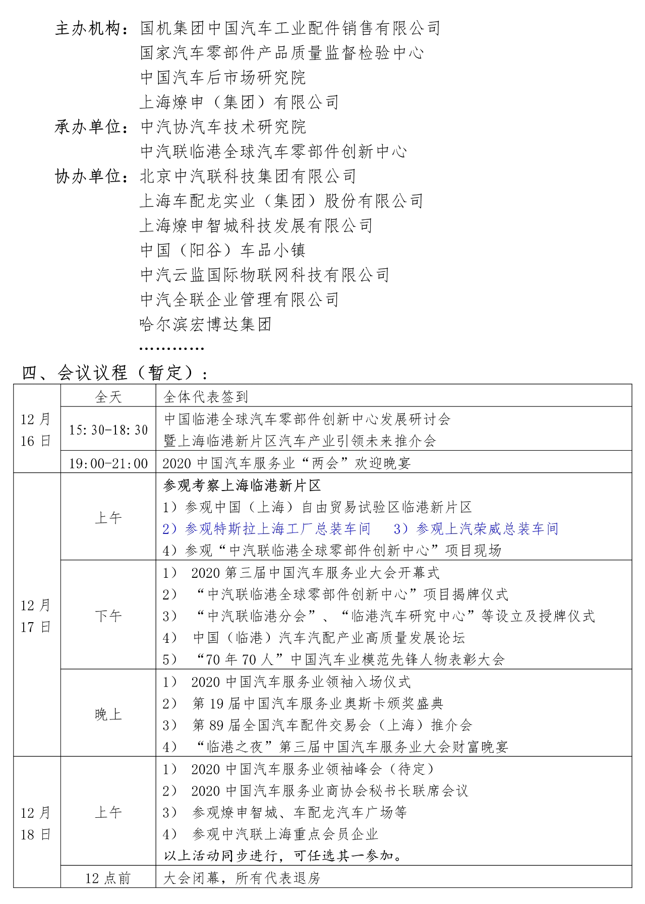 2020年,是全面建成小康社會和“十三五”規(guī)劃收官之年,是謀劃“十四五”規(guī)劃的關鍵之年,也是中國汽車工業(yè)創(chuàng)立70年,中國已連續(xù)十一穩(wěn)居世界第一產銷大國。中汽聯為認真貫徹落實國務院辦公廳關于“提升大眾創(chuàng)業(yè)萬眾創(chuàng)新示范基地帶動作用 進一步促改革穩(wěn)就業(yè)強動能”的實施意見(國辦發(fā)〔2020〕26號),深入實施創(chuàng)新驅動發(fā)展戰(zhàn)略,推動疫情新常態(tài)下的創(chuàng)新創(chuàng)業(yè)高質量發(fā)展,進一步推動經濟新常態(tài)下我國汽車企業(yè)實現可持續(xù)發(fā)展,以“守初心、擔使命、戰(zhàn)疫情”為主題的第三屆中國汽車服務業(yè)大會/2020中國汽車零部件創(chuàng)新發(fā)展大會(簡稱:中國汽車服務業(yè)“兩會”)暨2020中國(臨港)汽車汽配產業(yè)高質量發(fā)展論壇將于2020年12月16日-18日在中國(上海)自由貿易試驗區(qū)臨港新片區(qū)-上海臨港美爵酒店盛大舉行。