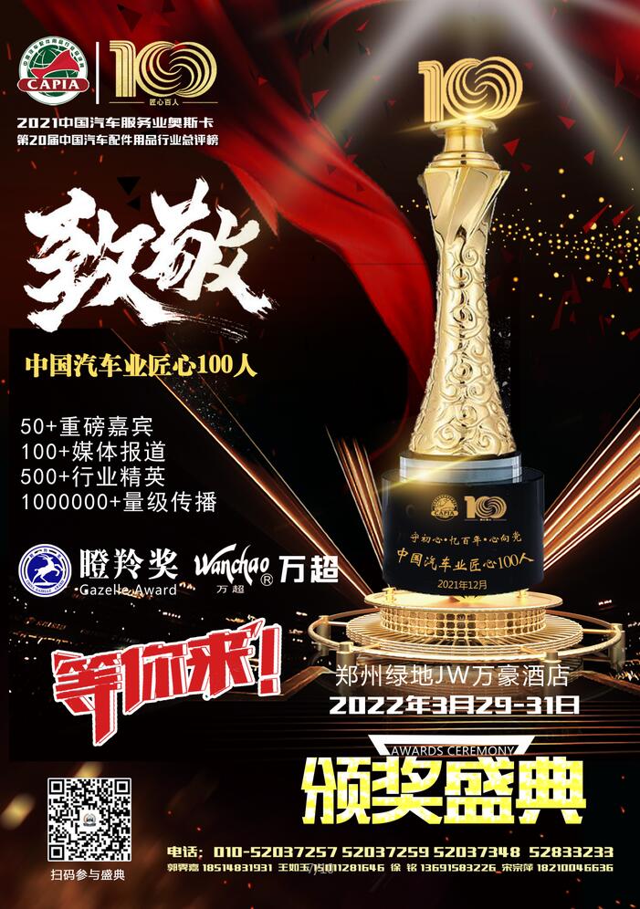 2021“萬超杯”第四屆中國汽車服務(wù)業(yè)大會將包括2021中國汽車零部件創(chuàng)新發(fā)展大會、中國汽車服務(wù)業(yè)領(lǐng)袖峰會、“百年百人”- 中國汽車業(yè)匠心100人表彰大會、中國汽車零部件企業(yè)資本賦能峰會、中國機(jī)動車全產(chǎn)業(yè)鏈備案溯源峰會、中國汽車汽配產(chǎn)業(yè)高質(zhì)量發(fā)展論壇、第20屆中國汽車服務(wù)業(yè)奧斯卡暨瞪羚獎頒獎盛典、中國汽車汽配百強(qiáng)企業(yè)家考察活動、中國汽車服務(wù)業(yè)兩會財富晚會等系列活動,并將集中表彰汽車行業(yè)在發(fā)展歷程中做出貢獻(xiàn)的匠心人物,向建黨100周年獻(xiàn)禮!