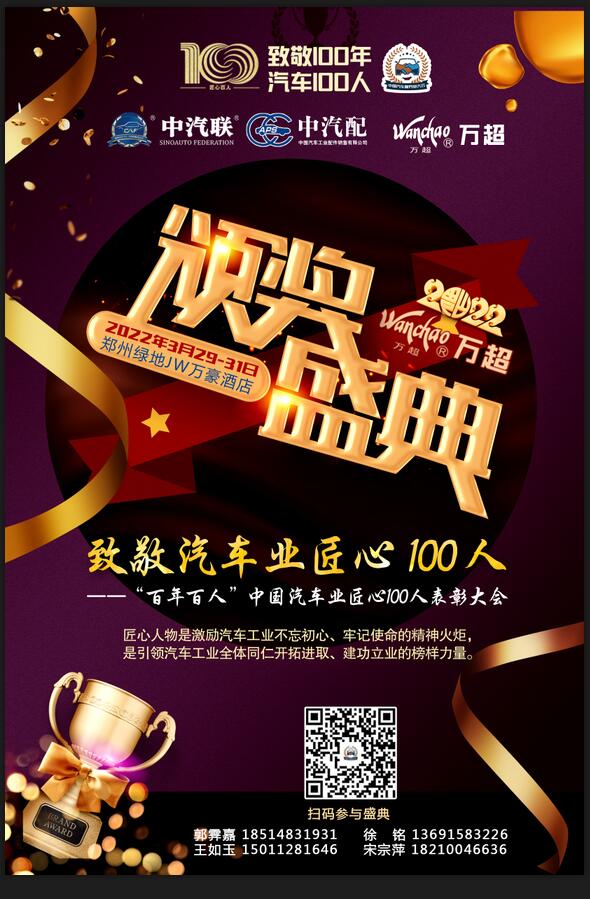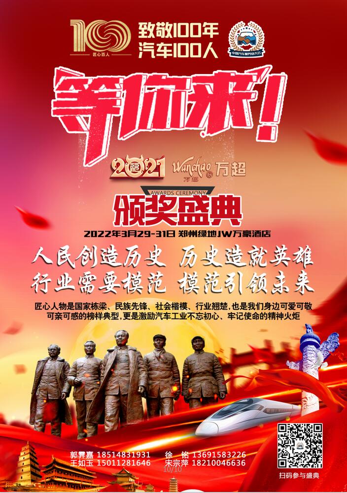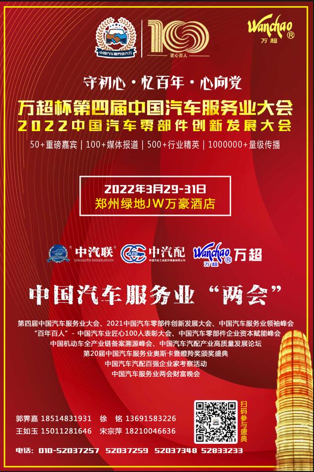 不忘初心,牢記使命。為貫徹落實國務(wù)院辦公廳關(guān)于服務(wù)“六穩(wěn)”“六保”進(jìn)一步做好“放管服”改革有關(guān)工作的意見(國辦發(fā)〔2021〕10號)精神,立足新發(fā)展階段、貫徹新發(fā)展理念、構(gòu)建新發(fā)展格局,深入實施創(chuàng)新驅(qū)動發(fā)展戰(zhàn)略,推動汽車產(chǎn)業(yè)高質(zhì)量發(fā)展,中汽聯(lián)擬在有關(guān)部門支持下,由國家汽車零部件產(chǎn)品質(zhì)量監(jiān)督檢驗中心、中國汽車工業(yè)配件銷售有限公司、中國車后市場研究院有限公司、中國維改交通信息管理中心、中汽環(huán)球汽配用品檢測認(rèn)證中心、上海萬超汽車天窗有限公司等機(jī)構(gòu)主辦的以“守初心、憶百年、心向黨”為主題的“萬超杯”第四屆中國汽車服務(wù)業(yè)大會、2021中國汽車零部件創(chuàng)新發(fā)展大會(簡稱:2021“萬超杯”中國汽車服務(wù)業(yè)“兩會”)將于2022年3月29-31日在鄭州綠地JW萬豪酒店舉行(俗稱的“大玉米”、“玉米棒”,高280米共60層,被譽(yù)為華中第一高樓,鄭州地標(biāo)性建筑之一),敬請您在百忙中出席。