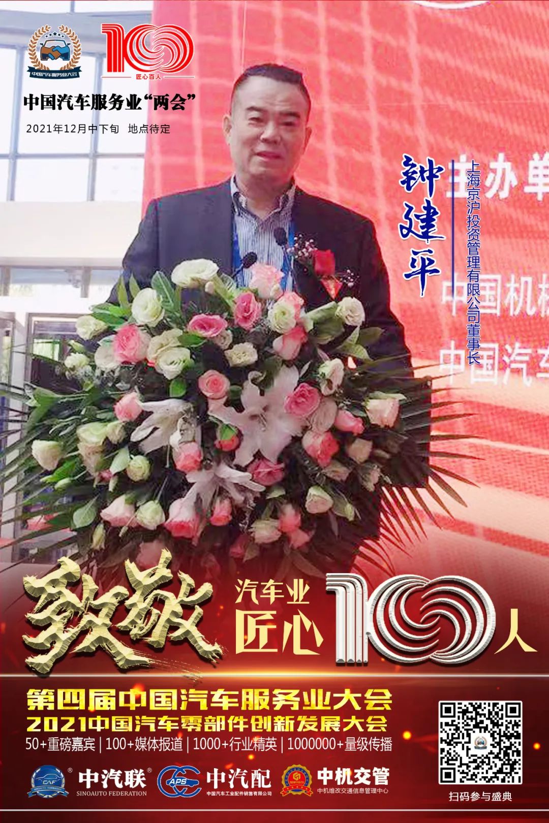 據(jù)第四屆中國(guó)汽車服務(wù)業(yè)大會(huì)組委會(huì)介紹,中汽聯(lián)常務(wù)副主席、上海京滬投資管理有限公司董事長(zhǎng)鐘建平入選“百年百人”中國(guó)汽車業(yè)匠心100人。
