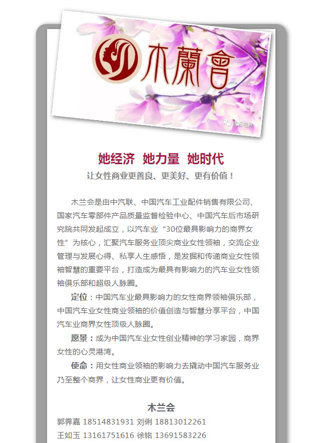 木蘭會成立于2019年,是由中國汽車工業(yè)配件銷售有限公司、國家汽車零部件產(chǎn)品質(zhì)量監(jiān)督檢驗中心、中國汽車后市場研究院及中汽聯(lián)共同發(fā)起成立,以汽車服務業(yè)”38位最具影響力的商界女性”為核心,匯聚汽車服務業(yè)頂尖商業(yè)女性領(lǐng)袖,交流企業(yè)管理與發(fā)展心得、私享人生感悟,是發(fā)掘和傳遞商業(yè)女性領(lǐng)袖智慧的重要平臺,打造成為最具有影響力的汽車服務業(yè)女性領(lǐng)袖俱樂部和超級人脈圈,成為最具影響力的女性商界領(lǐng)袖俱樂部。在此歡迎全國的木蘭朋友們加入木蘭會,讓我們在這個大家庭里尋訪商界木蘭,挖掘木蘭思想,編纂木蘭故事,弘揚木蘭精神,樹立木蘭榜樣,沉淀木蘭文化。木蘭會要積極推動商界女性思想精髓的交流與分享,倡導商界木蘭愛自己、愛家人、愛萬物,從而構(gòu)建商界木蘭的幸福家業(yè)、成功事業(yè)和慈善基業(yè),成為新時代的花木蘭。