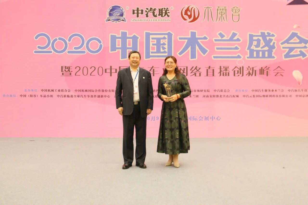 中汽聯(lián)副會長劉昌勇為中汽聯(lián)重型汽車配件委員會木蘭團(tuán)團(tuán)長梁霞頒發(fā)優(yōu)秀木蘭團(tuán)隊獎杯。