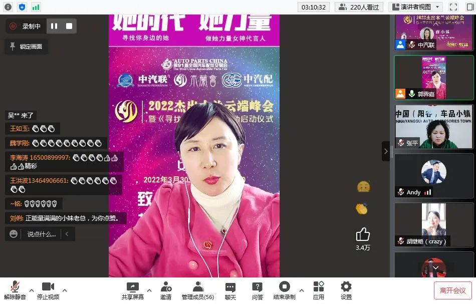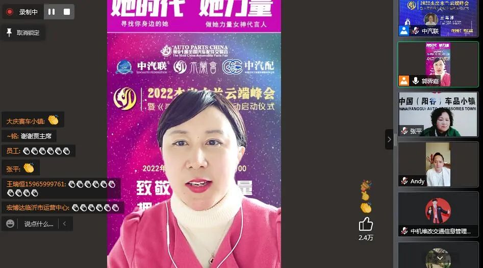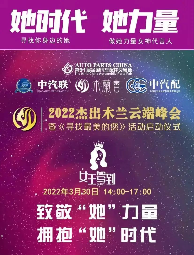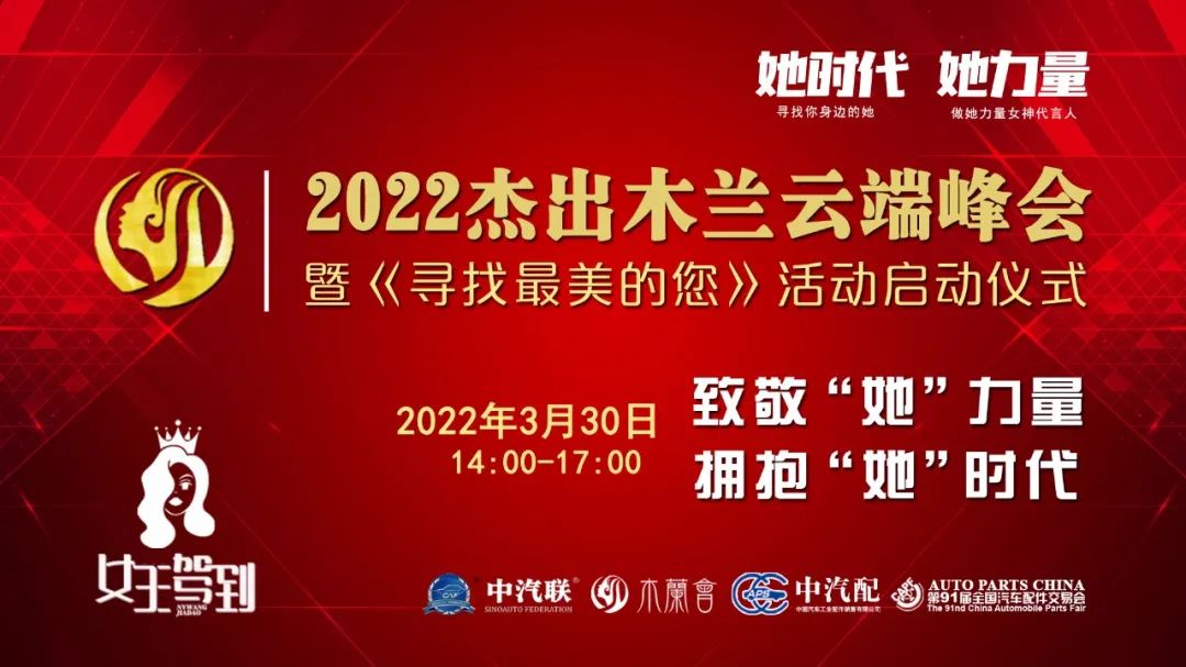 2022年3月30日,“致敬‘她’力量 擁抱‘她’時代”為主題的“2022杰出木蘭云端峰會暨《尋找最美的您》系列活動啟動儀式”在線上成功舉辦。本次峰會由第91屆全國汽車配件交易會特別支持,中汽聯(lián)、木蘭會、中國汽車工業(yè)配件銷售有限公司主辦。峰會聚焦當(dāng)代女性價值觀理念,探討如何在生機與挑戰(zhàn)共存、創(chuàng)新與奮斗并進的時代,克服困難突破局限,激發(fā)內(nèi)心力量,綻放女性光芒等社會關(guān)注話題,全面剖析木蘭創(chuàng)業(yè)心路歷程,再現(xiàn)木蘭在推動企業(yè)創(chuàng)新發(fā)展過程中舉足輕重的力量,以奔跑奮進的姿態(tài),譜寫木蘭“半邊天”的壯麗詩篇,以特殊的方式迎接黨的二十大勝利召開,助推中國汽車產(chǎn)業(yè)高質(zhì)量發(fā)展!
