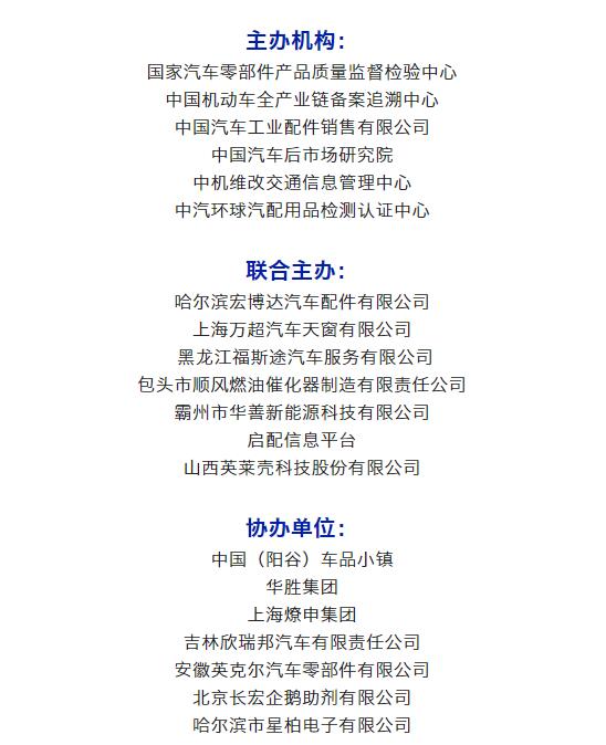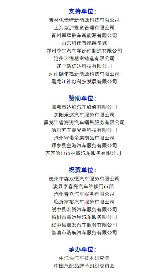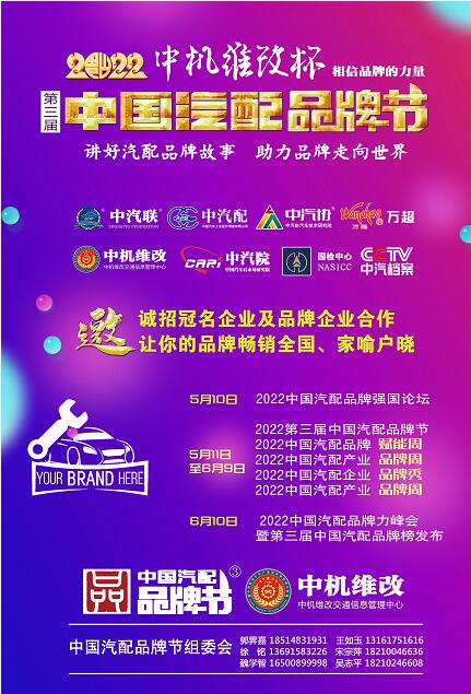 2022中機(jī)維改杯中國汽配品牌節(jié)由中汽聯(lián)、中汽配、中機(jī)維改共同主辦;哈爾濱宏博達(dá)汽車配件有限公司、上海萬超汽車天窗有限公司、 黑龍江福斯途汽車服務(wù)有限公司、包頭市順風(fēng)燃油催化器制造有限責(zé)任公司、霸州市華善新能源科技有限公司、啟配信息平臺、山西英萊殼科技股份有限公司聯(lián)合主辦;由中國(陽谷)車品小鎮(zhèn)、華勝集團(tuán)、上海燎申集團(tuán)、吉林欣瑞邦汽車有限責(zé)任公司、安徽英克爾汽車零部件有限公司、北京長宏企鵝助劑有限公司、哈爾濱市星柏電子有限公司友情協(xié)辦;由吉林優(yōu)佳特新能源科技有限公司、上海京滬投資管理有限公司、青州軍輝駐車新能源有限公司、山東科佳智能裝備城、鄭州尊生汽車零部件制造有限公司、滄州環(huán)銳精密鑄造有限公司、遼寧浩億達(dá)科技有限公司、河南頤爾福新能源科技有限公司、黑龍江神燈科技發(fā)展有限公司特別支持;邯鄲市達(dá)維汽車維修有限公司、沈陽樂達(dá)汽車服務(wù)有限公司、黑龍江省海濤汽車銷售服務(wù)有限公司、哈爾濱玉鑫兄弟科技有限公司、滄州守諾金屬制品有限公司、拜泉縣金海汽車服務(wù)有限公司、齊齊哈爾市林微汽車服務(wù)有限公司友情贊助;由德州市鑫雙恒汽車服務(wù)有限公司、浚縣李春亮汽車維修門市部 、滄州春立汽車服務(wù)有限公司、臨沂富裕汽車服務(wù)有限公司、綏中縣宏騰汽車服務(wù)有限公司、榆樹市鑫運(yùn)程汽車服務(wù)限公司、綏中縣鑫發(fā)汽車服務(wù)有限公司、臨清市浩航汽車服務(wù)有限公司特別祝賀。