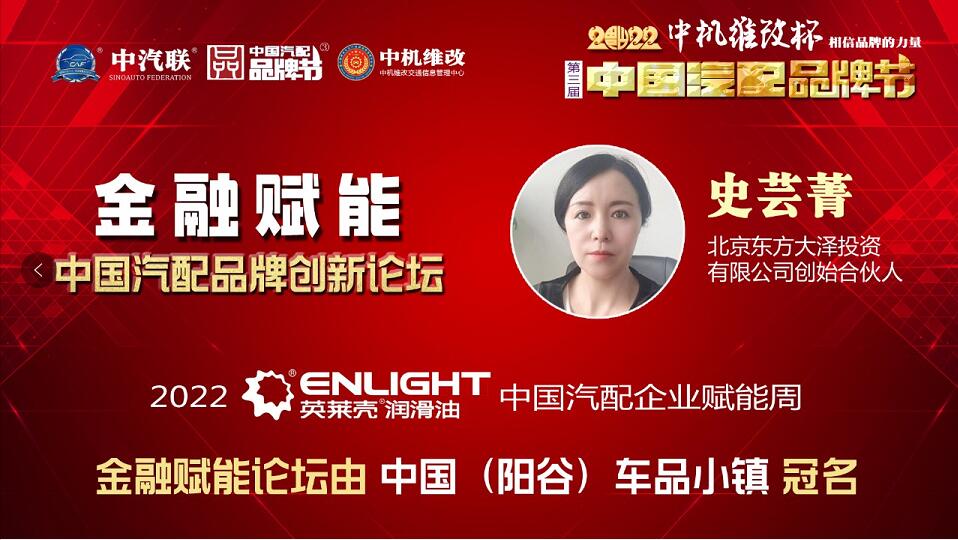 2022中國汽配品牌賦能周由山西英萊殼科技股份有限公司獨(dú)家冠名,在線上舉辦的賦能周第一場活動“金融賦能·2022中國汽配品牌創(chuàng)新論壇”由中國(陽谷)車品小鎮(zhèn)冠名特約播出,這是2022中機(jī)維改杯第三屆中國汽配品牌節(jié)系列活動的第四項(xiàng)活動。