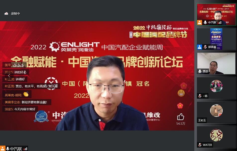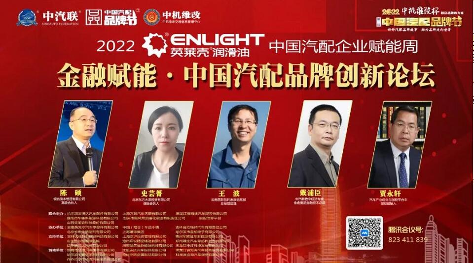 2022年5月16日,“2022 英萊殼杯 中國汽配品牌賦能周”的首場活動,由中國(陽谷)車品小鎮(zhèn)特約冠名的“金融賦能 · 2022中國汽配品牌創(chuàng)新論壇”在線上成功舉行,銀杏資本管理有限公司高級合伙人陳碩 、北京東方大澤投資有限公司創(chuàng)始合伙人史蕓菁、云南國際信托家族信托部總經(jīng)理助理王波、金盒集團(tuán)金融資本總裁、中汽聯(lián)首席數(shù)字經(jīng)濟(jì)專家戴浦臣 、汽車產(chǎn)業(yè)創(chuàng)業(yè)與創(chuàng)投平臺——車創(chuàng)投創(chuàng)始人賈永軒等五位金融界大咖作為嘉賓做了精彩分享,得到了眾多汽配企業(yè)家的關(guān)注,點(diǎn)贊量達(dá)到了550000個。金融賦能論壇由中汽聯(lián)執(zhí)行會長、中汽協(xié)汽車技術(shù)研究院院長喬永鋒主持。