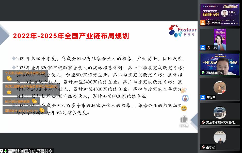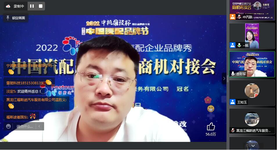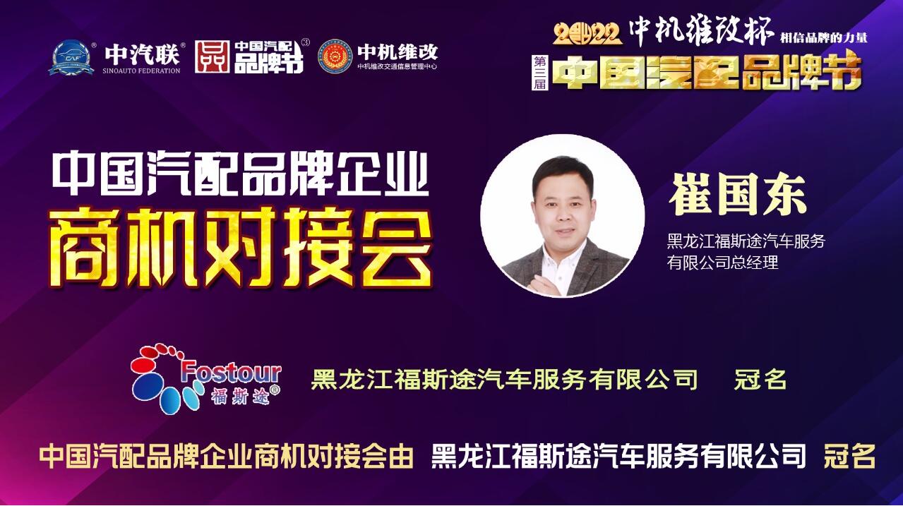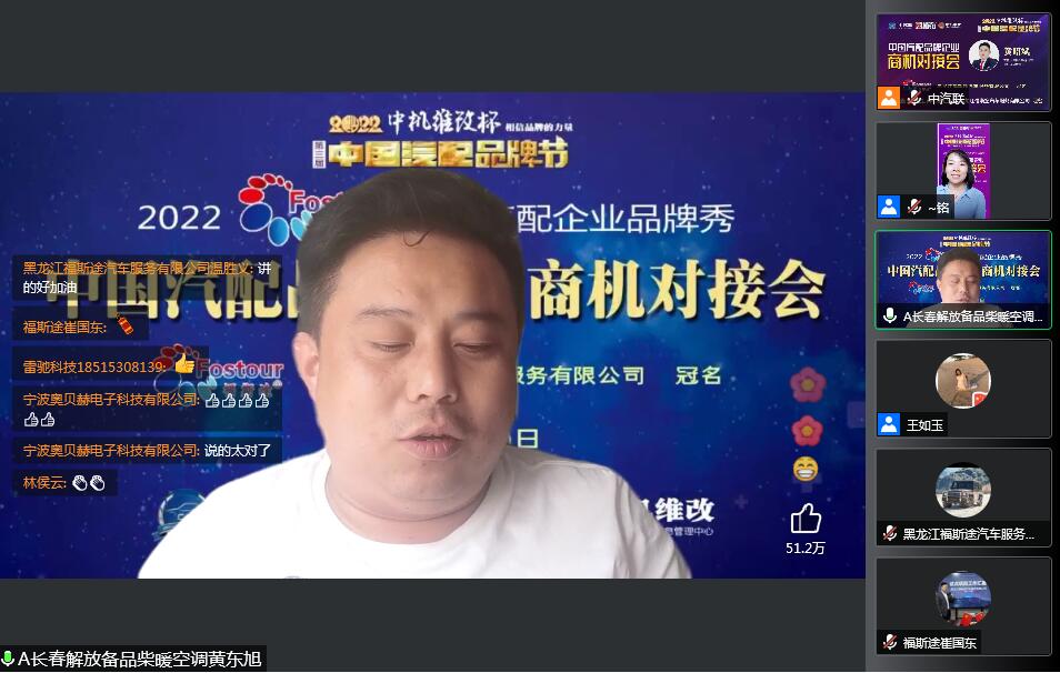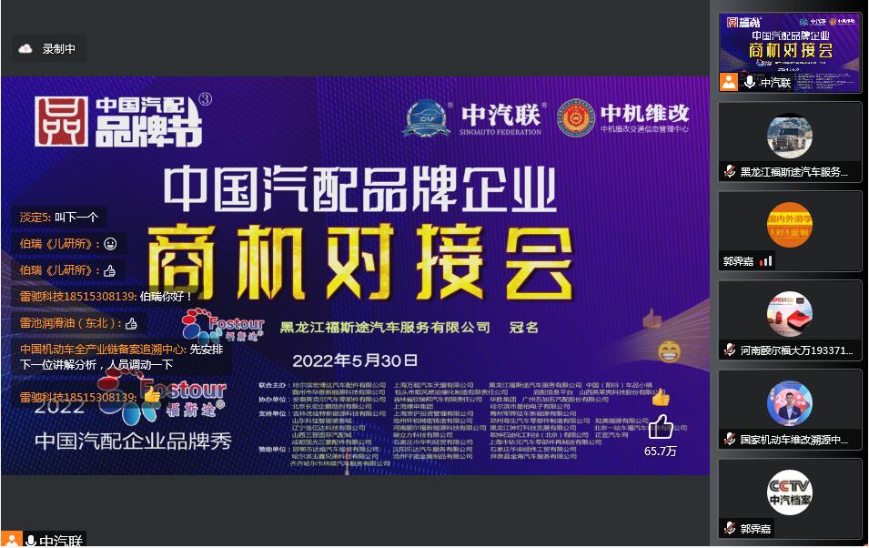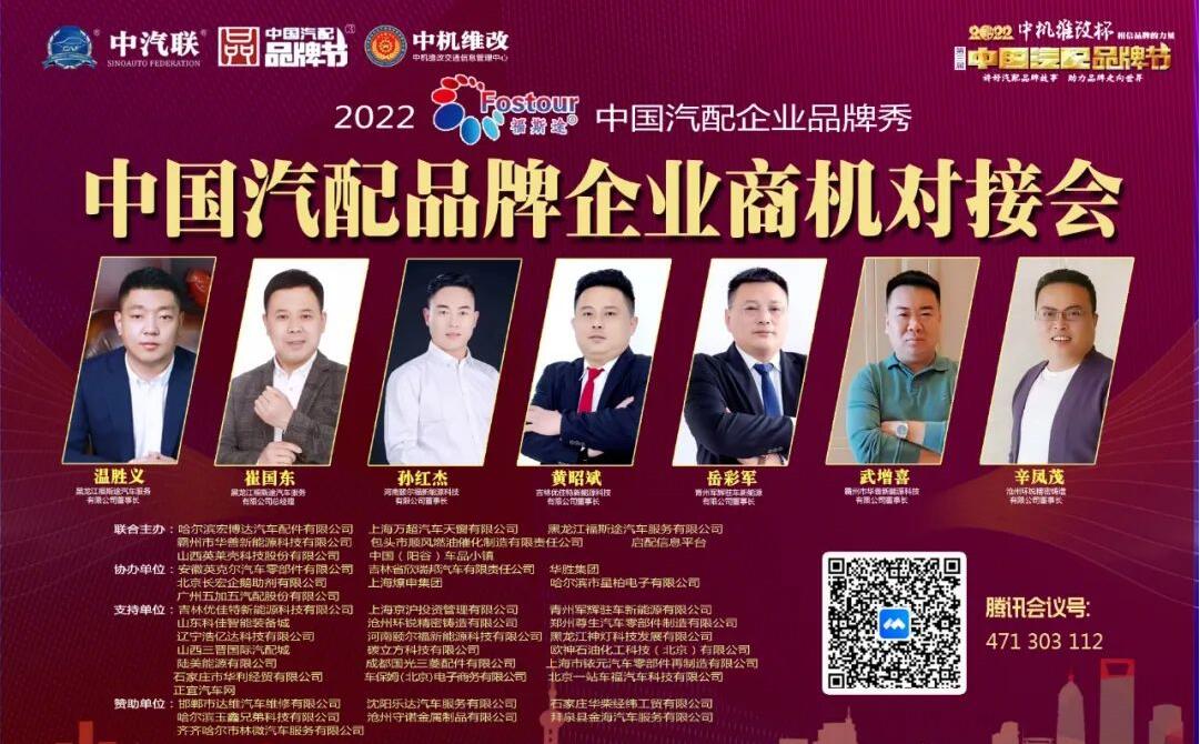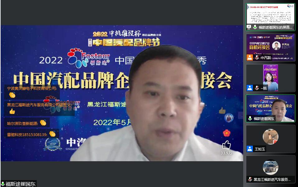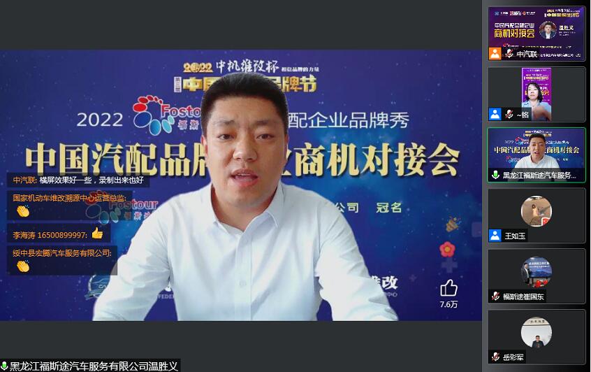 2022年5月30日,“2022 福斯途杯 中國汽配企業(yè)品牌秀”的第一場(chǎng)活動(dòng),由 黑龍江福斯途汽車服務(wù)有限公司 特約冠名播出的2022中國汽配品牌企業(yè)商機(jī)對(duì)接會(huì)在線上成功召開,黑龍江福斯途汽車服務(wù)有限公司董事長(zhǎng)溫勝義、總經(jīng)理崔國東,河南頤爾福新能源科技有限公司董事長(zhǎng)孫紅杰、吉林優(yōu)佳特新能源科技有限公司董事長(zhǎng)黃昭斌、青州軍輝駐車新能源有限公司董事長(zhǎng)岳彩軍、霸州市華善新能源科技有限公司董事長(zhǎng)武增喜 、滄州環(huán)銳精密鑄造有限公司董事長(zhǎng)辛鳳茂等嘉賓出席汽配企業(yè)品牌秀并做了精彩分享,引起了行業(yè)的廣泛關(guān)注,點(diǎn)贊數(shù)量達(dá)到657000個(gè)。2022中國汽配品牌企業(yè)商機(jī)對(duì)接會(huì)由中汽聯(lián)執(zhí)行秘書長(zhǎng)、中國汽配品牌節(jié)常務(wù)秘書長(zhǎng)徐銘主持。