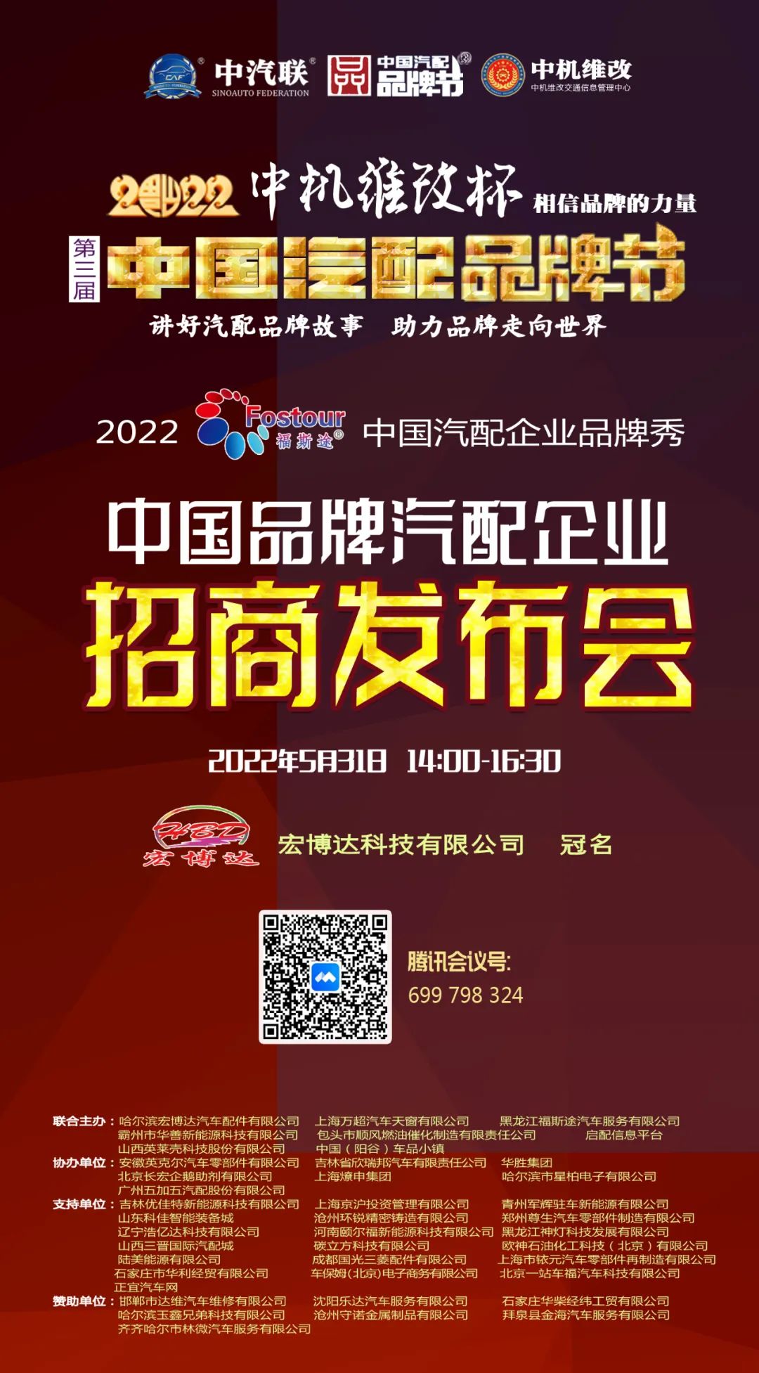 讓我們周二下午2點(diǎn),也就是5月31號(hào)下午2點(diǎn),相約由 宏博達(dá)科技有限公司 特約冠名的 “2022中國品牌汽配企業(yè)招商發(fā)布會(huì)”,讓我們明天下午2點(diǎn),不見不散!