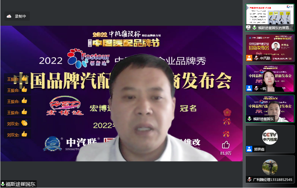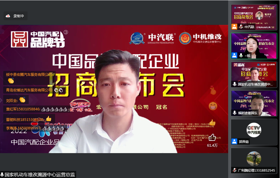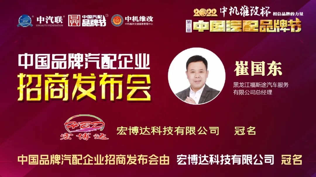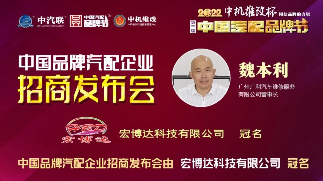 2022年5月31日,“2022 福斯途杯 中國汽配企業(yè)品牌秀”的第二場活動,由 宏博達科技有限公司 特約冠名播出的2022中國品牌汽配企業(yè)招商發(fā)布會在線上成功召開,宏博達科技有限公司COO李寶龍 、宏博達科技有限公司 CGO魏學(xué)智、黑龍江福斯途汽車服務(wù)有限公司總經(jīng)理崔國東 、廣州廣利汽車維修服務(wù)有限公司董事長魏本利等嘉賓出席汽配企業(yè)品牌秀并做了精彩分享,引起了行業(yè)的廣泛關(guān)注,點贊數(shù)量達到102萬個。2022中國品牌汽配企業(yè)招商發(fā)布會由中汽聯(lián)執(zhí)行秘書長、中國汽配品牌節(jié)常務(wù)秘書長徐銘主持。