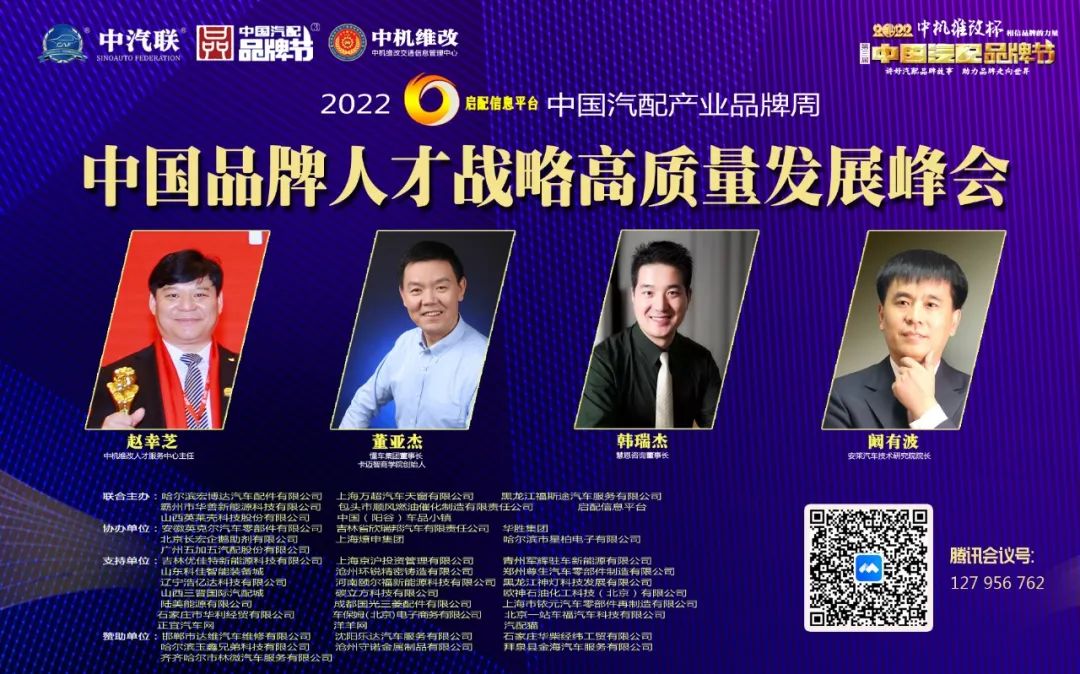 2022年6月9日,“2022 啟配信息平臺杯 中國汽配產(chǎn)業(yè)品牌周”的第四場活動,由 中機維改人才交流中心 特約冠名播出的2022中國品牌人才戰(zhàn)略高質(zhì)量發(fā)展峰會 在線上成功舉行,中機維改人才服務中心主任趙幸芝,懂車集團董事長、卡邁智商學院創(chuàng)始人董亞杰,慧恩咨詢董事長韓瑞杰,安萊汽車技術(shù)研究院院長闞有波 等四位汽配平臺大咖出席汽配產(chǎn)業(yè)品牌周并做了精彩分享,引起了廣泛關注,點贊數(shù)量達到98萬個。