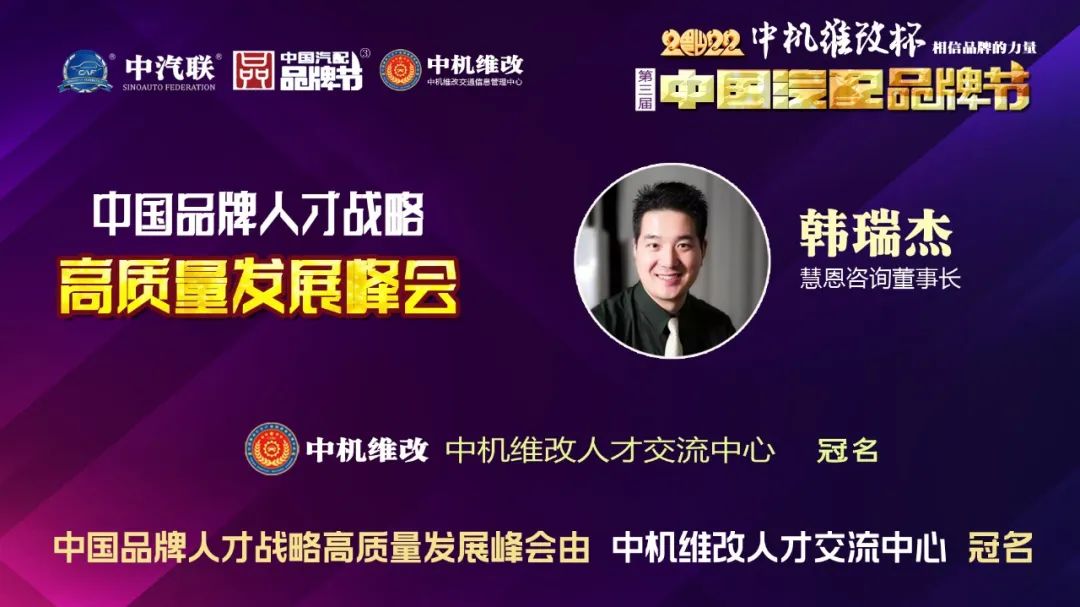 慧恩咨詢董事長韓瑞杰 出席2022中國品牌人才戰(zhàn)略高質(zhì)量發(fā)展峰會并做精彩分享。韓老師從事培訓教育事業(yè)十七年,從事汽車服務行業(yè)十五年時間,親自走訪上千家店面與企業(yè)家進行深入溝通探討,服務著數(shù)千家的終端店面和企業(yè)。對培訓和實戰(zhàn)操作有著非常豐富的經(jīng)驗,也是將培訓理念成功在山東汽車服務行業(yè)落地第一人。曾經(jīng)幫助實體企業(yè)三年五倍速的業(yè)績增長。團隊人員三年十倍增長變化,打造了眾所周知的企業(yè)文化系統(tǒng),受到了廣大客戶的歡迎。韓老師立足山東,服務全國,上千家山東汽車服務知名店面都接受過韓老師的培訓,得到了很大的幫助,具有良好的影響力和口碑。他睿智、幽默、深刻、直指核心,注重實戰(zhàn)、注重訓練、追求實效,重視成果轉(zhuǎn)化、可落地性極強。是國家注冊高級人力資源師、企業(yè)團隊心態(tài)訓練超級培訓師,是全國知名的企業(yè)實戰(zhàn)派運營專家。