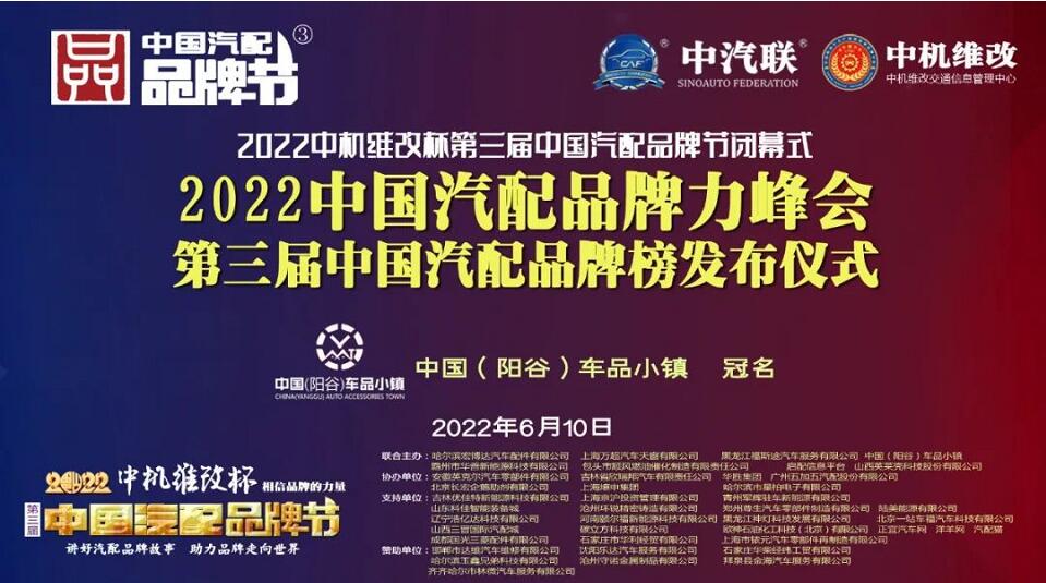 2022中機維改杯中國汽配品牌節(jié)由中機維改交通信息管理中心獨家總冠名,由中汽聯(lián)、中汽配、中機維改 共同主辦;哈爾濱宏博達(dá)汽車配件有限公司、上海萬超汽車天窗有限公司、中國(陽谷)車品小鎮(zhèn)、黑龍江福斯途汽車服務(wù)有限公司、包頭市順風(fēng)燃油催化器制造有限責(zé)任公司、霸州市華善新能源科技有限公司、啟配信息平臺、山西英萊殼科技股份有限公司 聯(lián)合主辦;由華勝集團、上海燎申集團、吉林欣瑞邦汽車有限責(zé)任公司、安徽英克爾汽車零部件有限公司、北京長宏企鵝助劑有限公司、哈爾濱市星柏電子有限公司、廣州五加五汽配股份有限公司 友情協(xié)辦;由吉林優(yōu)佳特新能源科技有限公司、上海京滬投資管理有限公司、青州軍輝駐車新能源有限公司、山東科佳智能裝備城、鄭州尊生汽車零部件制造有限公、滄州環(huán)銳精密鑄造有限公司、遼寧浩億達(dá)科技有限公司、河南頤爾福新能源科技有限公司、黑龍江神燈科技發(fā)展有限公司、山西三晉國際汽配城、歐神石油化工科技(北京)有限公司、碳立方科技有限公司、陸美能源有限公司、上海市銥元汽車零部件再制造有限公司、成都國光三菱配件有限公司、石家莊市華利經(jīng)貿(mào)有限公司、車保姆(北京)電子商務(wù)有限公司、北京一站車福汽車科技有限公司、正宜汽車網(wǎng)、洋羊網(wǎng)、汽配貓 特別支持;邯鄲市達(dá)維汽車維修有限公司、沈陽樂達(dá)汽車服務(wù)有限公司、哈爾濱玉鑫兄弟科技有限公司、滄州守諾金屬制品有限公司、拜泉縣金海汽車服務(wù)有限公司、齊齊哈爾市林微汽車服務(wù)有限公司、石家莊華柴經(jīng)緯工貿(mào)有限公司 友情贊助;由德州市鑫雙恒汽車服務(wù)有限公司、??h李春亮汽車維修門市部 、滄州春立汽車服務(wù)有限公司、臨沂富裕汽車服務(wù)有限公司、綏中縣宏騰汽車服務(wù)有限公司、榆樹市鑫運程汽車服務(wù)限公司、綏中縣鑫發(fā)汽車服務(wù)有限公司、臨清市浩航汽車服務(wù)有限公司、中能國業(yè)(北京)科技有限公司 特別祝賀。