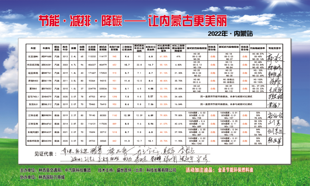 李校金董事長向王篤洋會長一行介紹了“金圣節(jié)能環(huán)保燃油”在赤峰市林西縣的技術(shù)驗證情況。2022年7月30日-8月3日,在林西縣人民政府的大力支持下,由林西縣交通局、中汽聯(lián)科技集團主辦,盛世昆仲(北京)科技發(fā)展有限公司技術(shù)支持,林西國際萬商城友情協(xié)辦的“節(jié)能·減排·降碳 讓內(nèi)蒙古更美麗 赤峰市林西縣在行動”活動成功舉行。共有11輛社會車輛參與道路測試,測試前均在林西汽車檢測量對車輛尾氣排放等綜合指標進行了檢測,測試加注1箱金圣節(jié)能環(huán)保油能行駛多少公里數(shù)。經(jīng)過4天的道路實測,均超出了大家的預(yù)期,行駛里程最高增加79.8%,最低也增加了25.7%,平均增效減排率在45%左右。